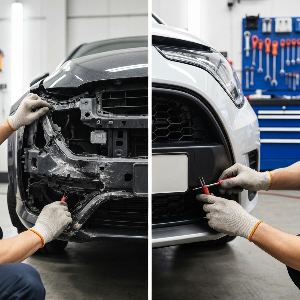 Bumper repair, plastic trim restoration, and component replacement for a like-new appearance.